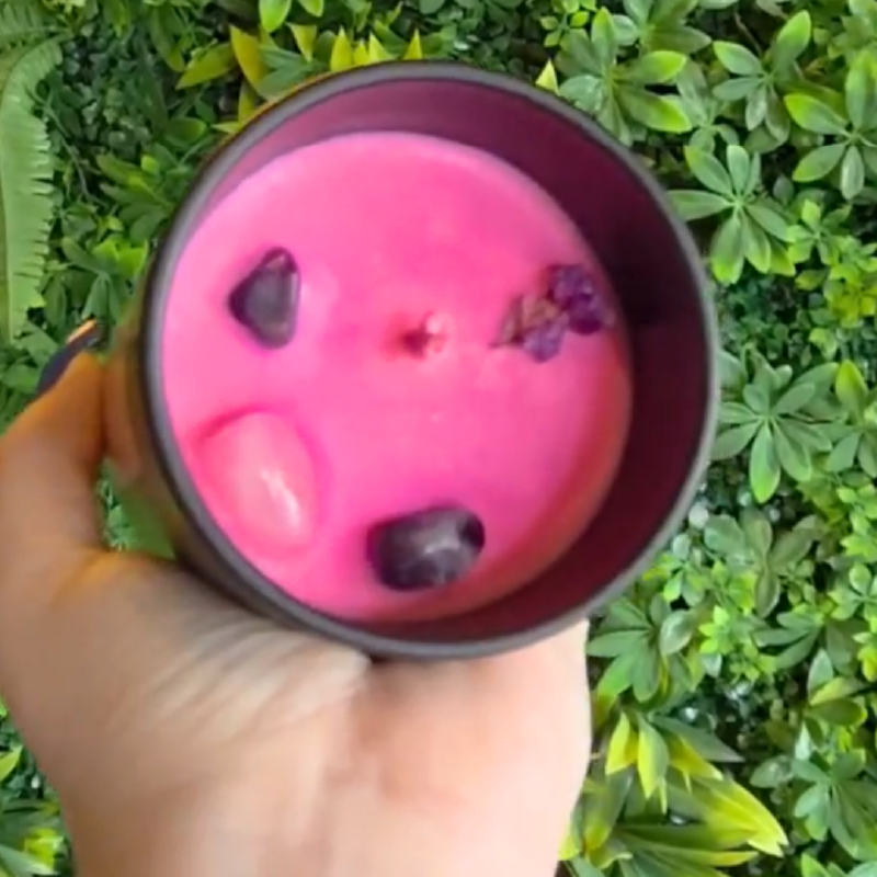 Ingredients: 100% soy wax, eco wick, rose quartz, amethyst crystals, forget-me-never flower, lavender, and vanilla fragrance oils.
